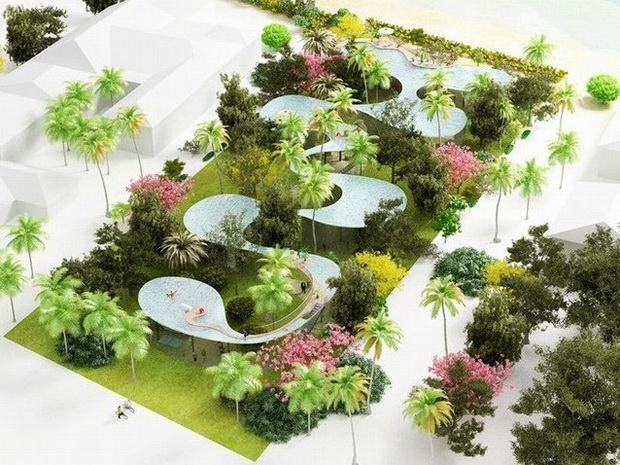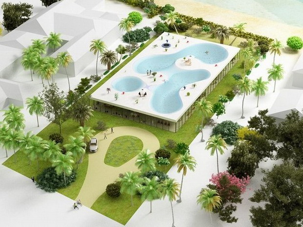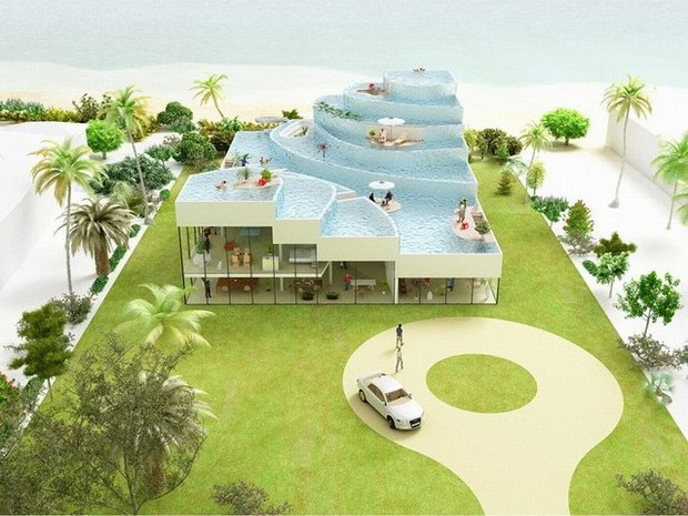 來自荷蘭的NLarchitects建筑事務(wù)所總能為我們帶來不一樣的新奇想法,很快他們設(shè)想了三個(gè)方案。都是將泳池架設(shè)在住宅的屋頂,房子的生活區(qū)位于泳池下面,以通透的玻璃幕墻圍合。通過泳池的不同形狀與深度劃分出下面的空間,上面的泳池儼然成為一個(gè)水上樂園!