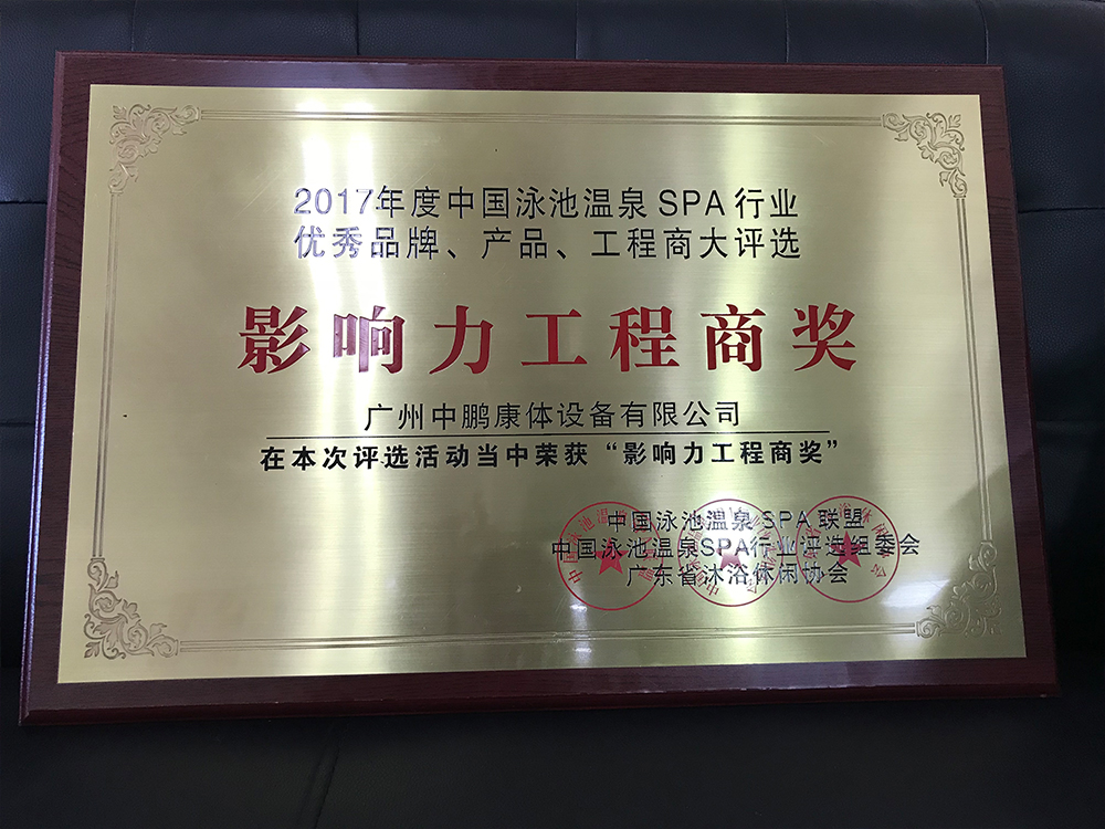 廣州中鵬康體設(shè)備有限公司一舉獲得“2017年度中國泳池溫泉SPA行業(yè)影響力工程商獎”的殊榮,足見廣州中鵬康體設(shè)備有限公司的整體綜合實力得到了泳池溫泉SPA行業(yè)界的肯定!