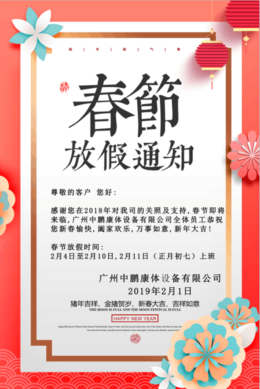 感謝您在2018年對(duì)我司的關(guān)照及支持,春節(jié)即將來(lái)臨,廣州中鵬康體設(shè)備有限公司全體員工恭祝您新春愉快,闔家歡樂,萬(wàn)事如意,新年大吉!